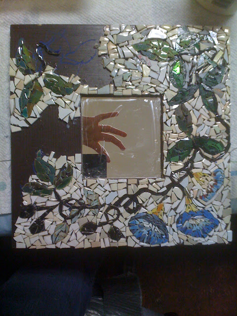 Materials: Malma Mirror, china marker, Weldbond or other mosaic glue, tweezers, tile nippers (hardware store item), dampened sponge, broken crockery, tiles, glass and nail file