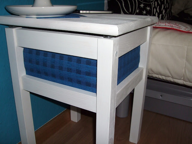 Description: We needed a small bedside table for our guestroom. As always, instead of simply buying one, we went to IKEA and got a stool named ODDVAR (77996709) and a curtain named INGMAJ (00212714). Using these and two drawer slides, we created a bedside locker with a sliding top board. In case you want to have your own: